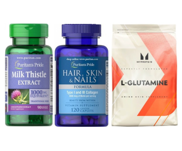 Glutamine використовується в раціоні людей, що тренуються, Milk Thistle Extract доповнює склад рослинним компонентом, а Hair Skin & Nails Formula містить колаген та мікронутрієнти для зовнішнього догляду.