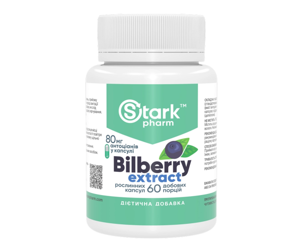 Харчова добавка Stark Pharm - Stark з екстрактом чорниці розроблена для інтенсивної підтримки зору та потужного антиоксидантного захисту. Продукт містить стандартизований екстракт ягід чорниці, традиційно відомої своєю здатністю зміцнювати зорові функції.