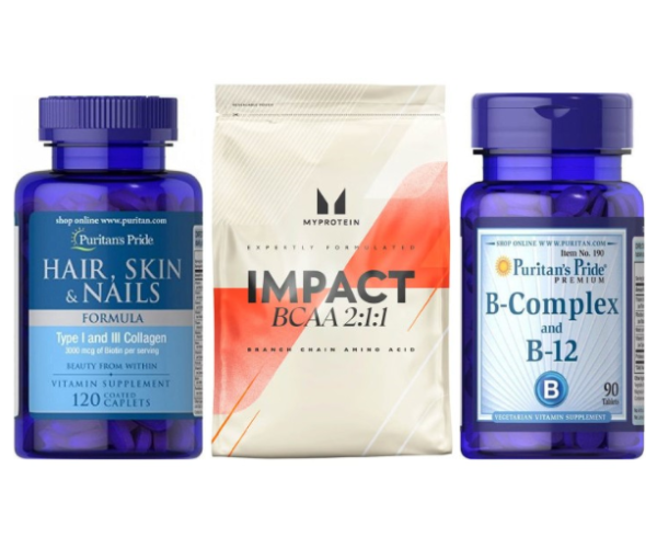 BCAA часто використовуються під час фізичних навантажень, B-Complex містить вітаміни групи B, а Hair Skin & Nails Formula доповнює набір колагеном та мікронутрієнтами.