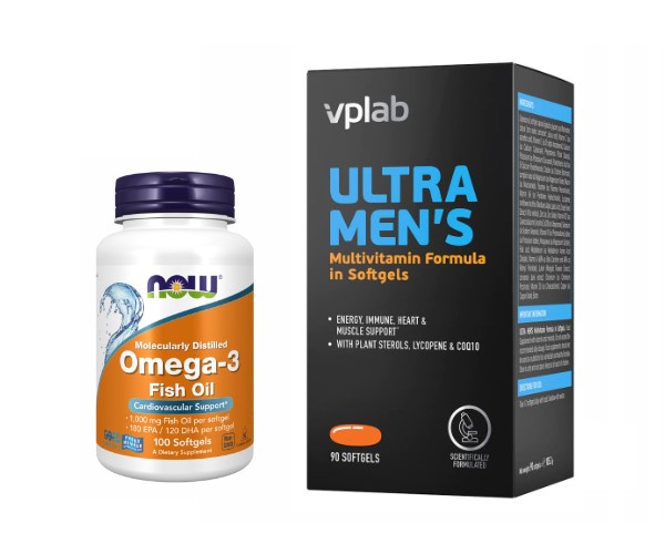 **У наборі:** 1. **Ultra Men's Multivitamin – 90 softgels** - Спеціально розроблений мультивітамінний комплекс для чоловіків. - Містить вітаміни A, C, D, E, групи B, а також ключові мінерали для підтримки: - енергійності та працездатності; - імунної системи; - здоров’я серця, м’язів та кісток; - чоловічого гормонального балансу та репродуктивної функції. - Формат softgels забезпечує кращу засвоюваність та зручність прийому.