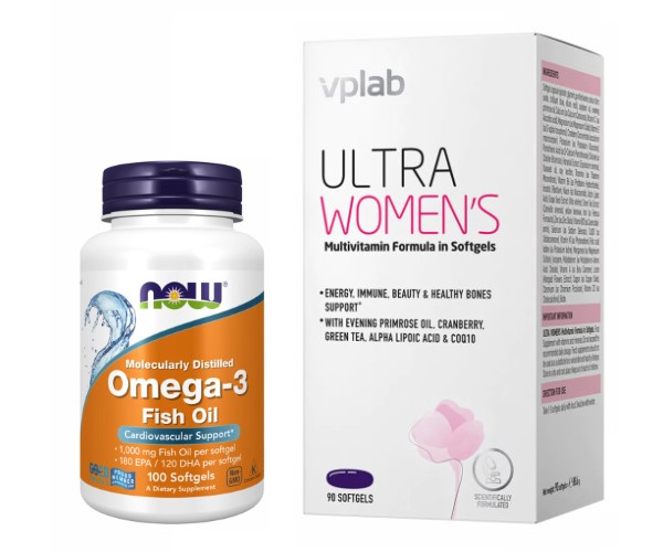 Набір **«Здоров’я щодня для жінок»** – це продумана щоденна підтримка жіночого організму, що поєднує **Ultra Women's Multivitamin (90 капсул)** та **Omega-3 1000 mg (100 капсул)**. Мультивітамінний комплекс містить ключові вітаміни й мінерали, які сприяють збереженню енергії, підтримці гормонального балансу, зміцненню імунітету, здоров’ю шкіри, волосся та нігтів. Він допомагає компенсувати нестачу поживних речовин у раціоні, особливо за умов стресу, високої зайнятості чи нерегулярного харчування. Omega-3 1000 mg забезпечує організм цінними жирними кислотами EPA та DHA, які сприяють нормальній роботі серця, мозку та зору, зменшенню запальних процесів і підтримці здоров’я суглобів. Разом ці добавки створюють комплексну програму щоденного догляду за жіночим здоров’ям, підходять для тривалого прийому та є зручним рішенням для сучасних жінок, які цінують активний ритм життя та власне самопочуття.