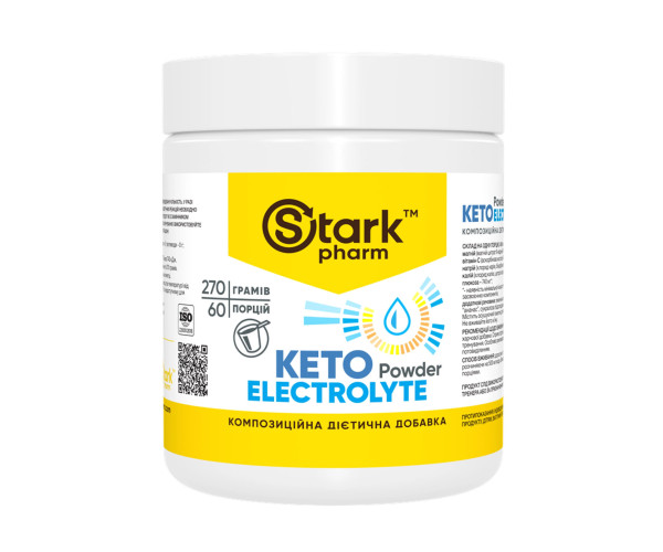 Харчова добавка Stark Pharm - Stark Keto Electrolyte Powder містить комплекс електролітів, які є життєво важливими для багатьох функцій в організмі, а саме: підтримка балансу рідини, гідратація, скорочення м’язів, передача нервових імпульсів та надходження поживних речовин у клітини. Комплексна добавка у формі порошку зі смаком ананасу.