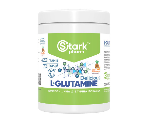 Харчова добавка Stark Pharm – Stark Glutamine Delicious містить умовно незамінну амінокислоту глютамін , вживання якої підтримує здоров'я кишечника, сприяє зміцненню імунітету, покращує роботу мозку, а також є незамінним помічником у відновленні м'язів після навантажень. Крім того, глютамін сприяє загальному антиоксидантному захисту організму. Амінокислота глютаміну служить джерелом енергії для клітин, її участь у синтезі білків та підтримці азотистого балансу допомагає запобігати руйнуванню м'язів.