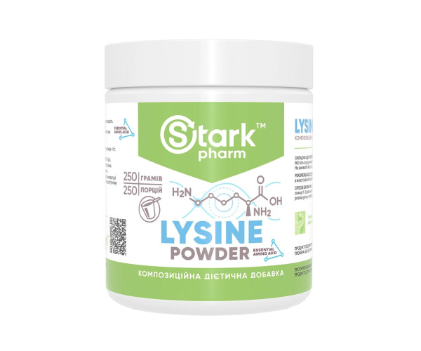 Харчова добавка Stark Pharm - Stark Lysine Powder містить амінокислоту лізин в порошковій формі без смакових добавок. L-лізин належить до незамінних амінокислот, які не синтезуються організмом, а надходять в нього виключно з продуктами харчування (достатня кількість L-лізину міститься в продуктах з високим вмістом балка) або під час вживання харчових добавок.
