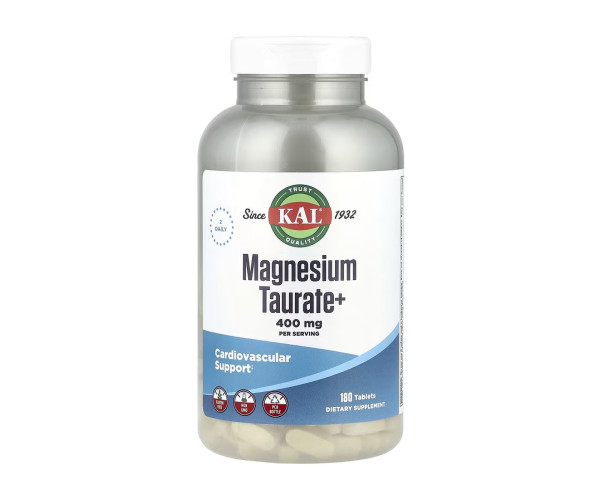 Інформація про продукт. Таурат магнію+ від KAL® містить мікроелемент магній і амінокислоту таурин у вільній формі. Таурат магнію+ забезпечує поживну підтримку для здоров’я кісток, серцево-судинної системи, м’язів, розслаблення, клітинної енергії, здоров’я зубів і роботи нервів. Піридоксаль-5-фосфат (вітамін B6) може забезпечити поживну підтримку для нормального синтезу еритроцитів.