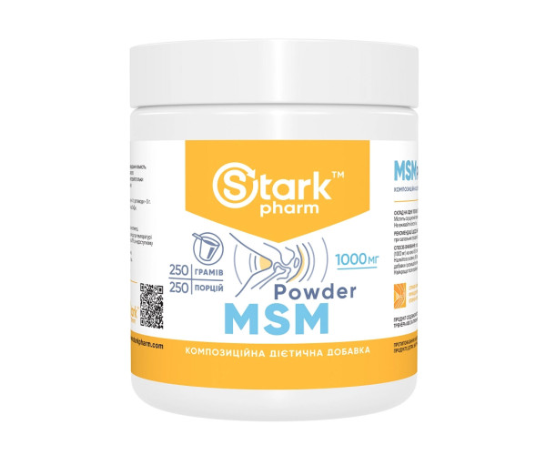 Харчова добавка Stark Pharm – MSM містить метилсульфонілметан (МСМ), який є органічною сполукою сірки. Сірка бере участь у синтезі колагену та кератину. Ці речовини необхідні для підтримки сильного та здорового волосся, шкіри та нігтів.