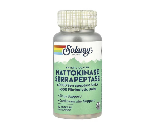 Наттокіназа та серрапептаза Solaray призначені для підтримки серцево-судинної системи, кровообігу та носових пазух. Вона вкрита кишковорозчинною оболонкою, що допомагає капсулі витримувати кислоту шлунка та проникати в тонкий кишечник.