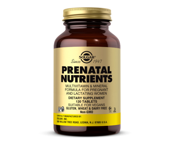 Solgar® Prenatal Nutrients — це запатентована формула, яка забезпечує 100% добову норму більшості основних вітамінів і мінералів для вагітних і годуючих жінок. Потреби в харчуванні суттєво змінюються протягом цього часу, і лише дієти не завжди може бути достатньо для задоволення цих необхідних рівнів. Ця добавка забезпечує збалансоване поєднання поживних речовин, таких як кальцій, залізо, фолієва кислота та антиоксиданти, а також бета-каротин, вітаміни С і Е. Вагітні жінки мають підвищену потребу в залізі. Достатня кількість фолієвої кислоти в здоровому харчуванні може зменшити ризик народження жінки з вадою головного або спинного мозку.