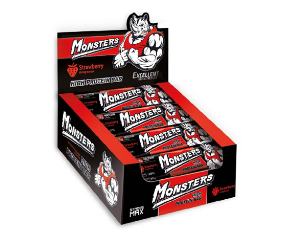 Самый большой и лучший батончик в Украине. Целых 28 граммов высококачественного белка на 80 граммов батончика. В качестве источника белка используются концентрат сывороточного белка, изолят сывороточного белка и казеин. Всего 21 грамм углеводов. В составе вы не найдете сгущённого молока, мальтодекстрина и других «не диетических» ингредиентов, которые так любят использовать многие производители. Протеиновые батончики Monsters — удобный, быстрый и вкусный способ получить необходимую порцию настоящего белка и перекусить в течение дня. Пищевая ценность 1 батончика (80 граммов): Энергетическая ценность: 274 ккал Белки 28,6 г; жиры 6,4 г; углеводы 21 г. Состав: патока, концентрат сывороточного белка 22,63%, изолят сывороточного белка 13,48%, фруктоза, казеинат натрия, курага, глазурь кондитерская (сахар белый кристаллический, жир растительный, соевый лецитин, ароматизатор «Какао», соль поваренная)