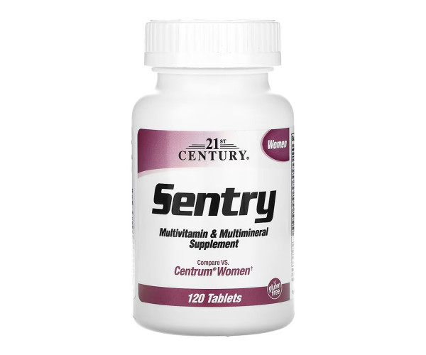 Sentry Women — це комплексний мультивітамін мінеральний препарат, спеціально розроблений для жінок, який містить понад 20 важливих вітамінів та мінералів, включно із залізом, кальцієм, фолієвою кислотою, вітамінами A, D3, E та групи B для підтримки енергії, обміну речовин, імунітету, здоров’я кісток і репродуктивної системи. Продукт без глютену та не містить ГМО