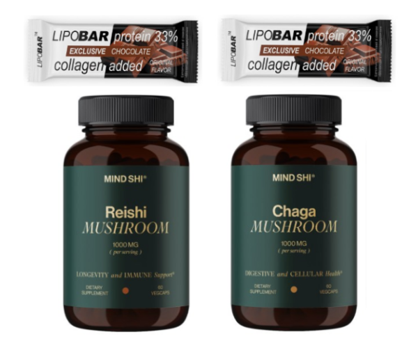 Набір "Mushroom Combo" - Reishi Mushroom 1000 mg - 60 vegcaps ПЛЮС Chaga Mushroom 1000 mg - 60 vegcaps Плюс Lipobar Exclusive - 50g 2 шт.