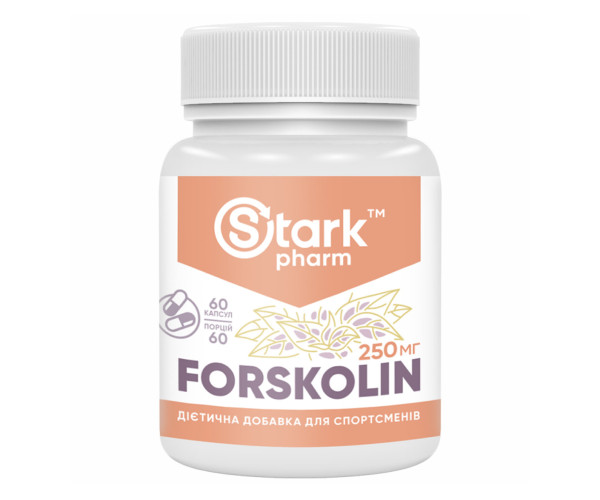 Це біологічно активна речовина натурального походження, що отримується з багаторічної трав'янистої рослини Coleus forskohlii. Використовується в медичних цілях і спорті, для отримання екстрактів кореня, які мають різноманітні фізіологічні ефекти. Форсколін виявляє свою дію на організм, головним чином, за рахунок активації ферменту аденілатциклази, внаслідок чого відбувається підвищення рівня цАМФ у внутрішньоклітинному просторі. ЦАМФ - це важливий та багатофункціональний передавач клітинних сигналів, які передають гормони та інші біохімічні медіатори. За допомогою цАМФ здійснюється зворотний зв'язок клітин осі гіпоталамус-гіпофіз. Таким чином, форсколін впливає на багато процесів в організмі, за рахунок вищезгаданих посередників. Доведені ефекти форсколіну: Форсколін суттєво збільшує продукцію тестостерону (доведено незалежним дослідженням) внаслідок чого спостерігається приріст сухої м'язової маси; У цьому ж дослідженні форсколін сприяв зниженню жирової маси тіла. Саме з цього дослідження почалося активне застосування форсколіну у спортивному харчуванні; Судинорозширювальний ефект, який також корисний у бодібілдингу, оскільки за рахунок цього покращується живлення м'язів; Форсколін підвищує стійкість до дії ультрафіолетового випромінювання, роблячи засмагу темнішою; Пригнічує інфекції сечостатевої системи. Може застосовуватись у комбінації з антибіотиками; Протипухлинний ефект; Форсколін відновлює периферичні нервові волокна. Склад (на одну капсулу) Stark Coleus Forskohlii: Форсколін (корінь, стандартизований 10% екстракт) 250 мг. Рекомендації: Приймайте по одній капсулі (250 мг) двічі на день. Не перевищуйте добову норму 1000 мг.