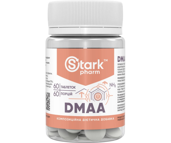 При фізичних навантаженнях як аеробних, так і анаеробних активізується термогенний ефект при вживанні ДМАА. Прискорюється розщеплення жирових запасів. Stark DMAA Stark Pharm (Старк ДМАА Старк Фарм) можна використовувати як жироспалювач. Спортсмени, використовуючи ДМАА, відчувають приплив сил та енергії, тренування стають більш продуктивними та тривалими. Люди з активною життєвою позицією, які не займаються спортом, зазначають, що вживання ДМАА допомагає запам'ятовувати великий обсяг інформації. Склад Stark DMAA Stark Pharm (на 1 таблетку): Екстракт герані – 50 мг L-теанін – 20 мг Інші компоненти: