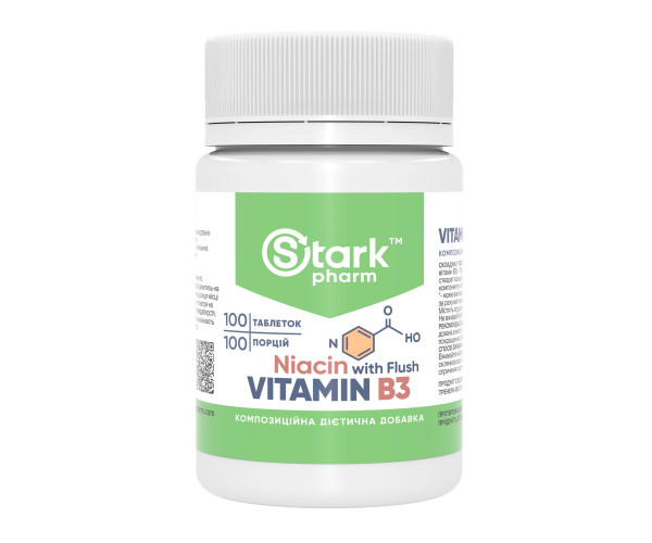 Харчова добавка Stark Pharm - Stark Niacin (Vitamin B3 with Flush) містить ніацин, який належить до вітамінів групи B. Наш організм потребує ніацину для регуляції рівня цукру в крові, він бере участь в енергетичному обміні. Також ніацин здатен позитивно впливати на настрій, сон та серцеву діяльність.